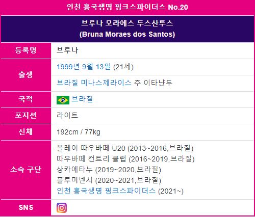 흥국생명 핑크스파이더스 배구단은 2021년 1월 7일 루시아 프레스코 선수를 대체할 외국인 선수로 브라질 출신의 공격수 브루나 모라이스 선수를 영입했다고 밝혔습니다. 기존의 외국인 선수인 루시아 프레스코 선수는 지난 2020년 12월 5일 GS칼텍스와의 경기에서 어깨 부상을 입었습니다.