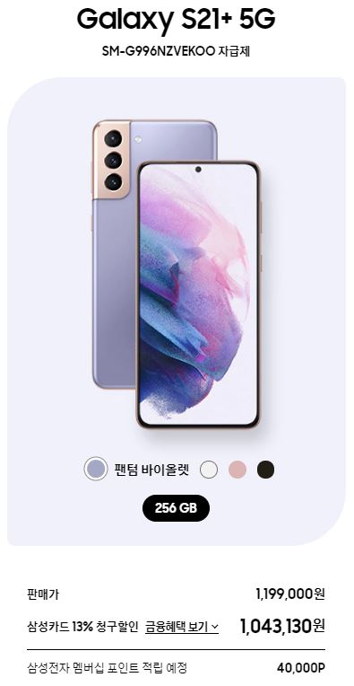 가장 가성비가 좋다고 평가받는 모델인 갤럭시 S21 플러스 스펙을 알아보겠습니다. 갤럭시 S21 플러스 프로세스는 엑시노스 2100, 메모리는 8GB, 디스플레이는 120Hz 주사율을 지원하는 6.7 FHD+, 저장공간은 256GB, 배터리 용량은 4,800mAh, 무게는 200g입니다. 갤럭시 S21 플러스 색상은 팬텀 바이올렛, 팬텀 실버, 팬텀 핑크, 팬텀 블랙까지 총 4가지로 출시하였습니다.
