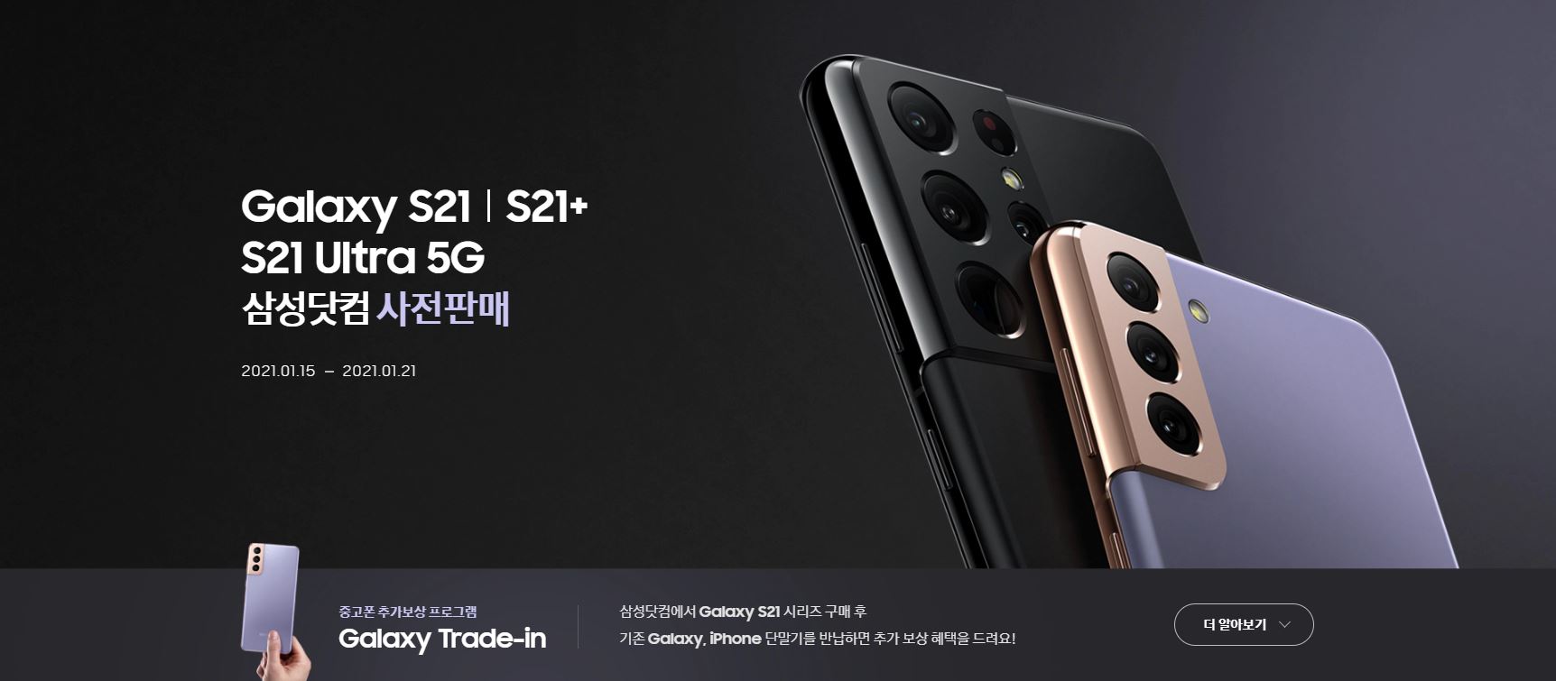 먼저 저번시간 내용을 정리해보겠습니다. 갤럭시 S21 사전예약 기간은 2021년 1월 15일 금요일부터 2021년 1월 21일 목요일까지이고 갤럭시 S21 출시일은 2021년 1월 29일 금요일입니다. 현재 삼성닷컴 홈페이지 사전예약을 통해서 구매한다면 여러가지 사은품을 주는 것과 단독컬러 한정판매를 진행하고 있습니다.