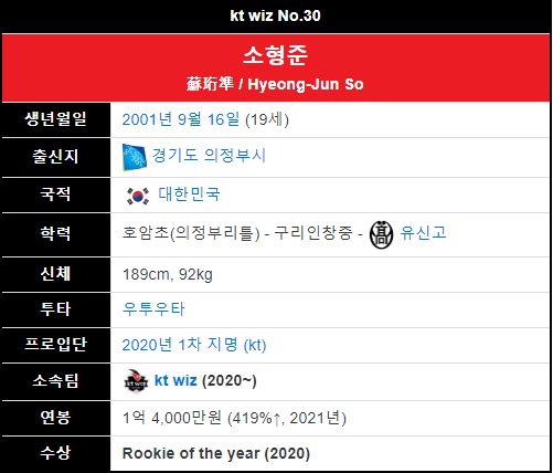 kt 위즈 소형준 야구선수는 경기도 의정부시 출신으로 나이는 2001년 9월16일 생으로 만 19세입니다. 소형준 야구선수 키는 189cm이고 몸무게는 92kg으로 외국인투수 부럽지 않은 큰 키와 강한 어깨를 가지고 있습니다. 지난 2020년 신인 드래프트 1차 지명으로 kt 위즈에 지명받아 계약금 3억 6,000만원에 계약을 체결하며 입단하게 되었습니다.