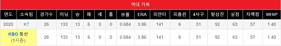 2020년 프로야구 시즌 kt 위즈 소형준 야구선수 성적은 총 26경기 출장 13승 6패 3.86평균자책점 45사사구 92탈삼진 63실점 57자책점 1.40WHIP를 기록하였습니다. kt 위즈 소형준 야구선수는 2020년 프로야구 시즌 kt 위즈를 창단 후 첫 포스트시즌 진출에 큰 기여를 한 선수입니다.