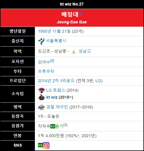 프로야구 kt 위즈가 2021년 프로야구 시즌 재계약 대상자 53명 가운데 52명과 연봉계약을 모두 체결하였다고 발표하였습니다. kt wiz 2021년 시즌 최고 연봉 인상률을 기록한 선수는 신인왕 소형준 야구선수로 419% 인상률은 역대 팀내 최고 인상률입니다. 그리고 오늘의 주인공 kt wiz 배정대 야구선수는 kt wiz 야수 가운데서 가장 높은 연봉 인상률을 기록하였습니다.