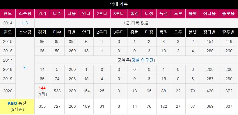 연습경기때부터 기대감을 모았던 kt wiz 배정대 야구선수는 2020년 프로야구 시즌 시작과 동시에 팀 성적을 끓어 올렸습니다. 2020년 프로야구 시즌 kt wiz 배정대 야구선수 성적은 총 144경기 0.289타율 13홈런 65타점 88득점 22도루 73사사구 0.420장타율 0.372출루율을 기록하였습니다.