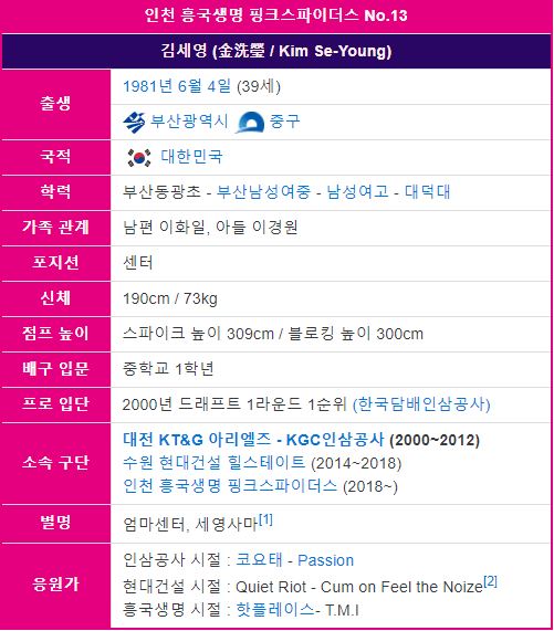 흥국생명 핑크스파이더스 김세영 배구선수는 부산광역시 중구 출신으로 나이는 1981년 6월 4일 생으로 만 39세입니다. 김세영 배구선수는 결혼을하여 아들이 있는 엄마 배구선수입니다. 그래서 엄마센터라는 별명을 가지고 있고, 김세영 배구선수 키는 190cm이고 몸무게는 73kg입니다.