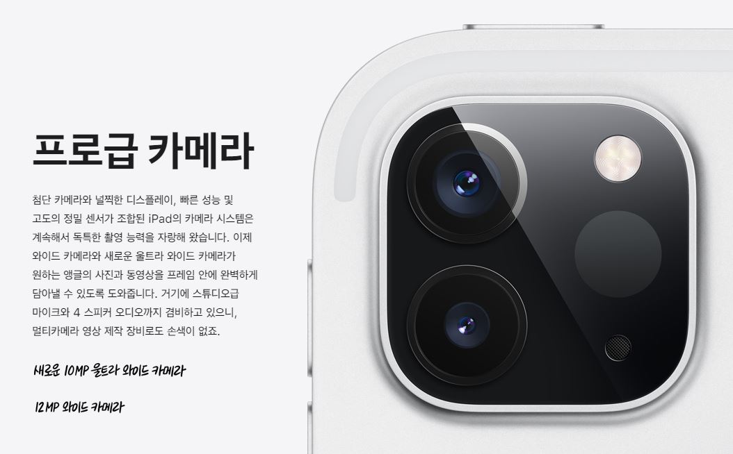 네 번째, 아이패드 프로 5세대 스펙은 카메라입니다. 이전 세대인 4세대와 같은 카메라 스펙이 탑재될 것으로 알려졌습니다. 아이패드 프로 5세대 후면카메라는 1,200만 화소의 와이드카메라와 1,000만 화소의 울트라 와이드카메라 총 2개의 듀얼카메라로 구성될 것이고 유출된 렌더링 이미지 상으로는 카툭뒤가 더 나올 것 같습니다.