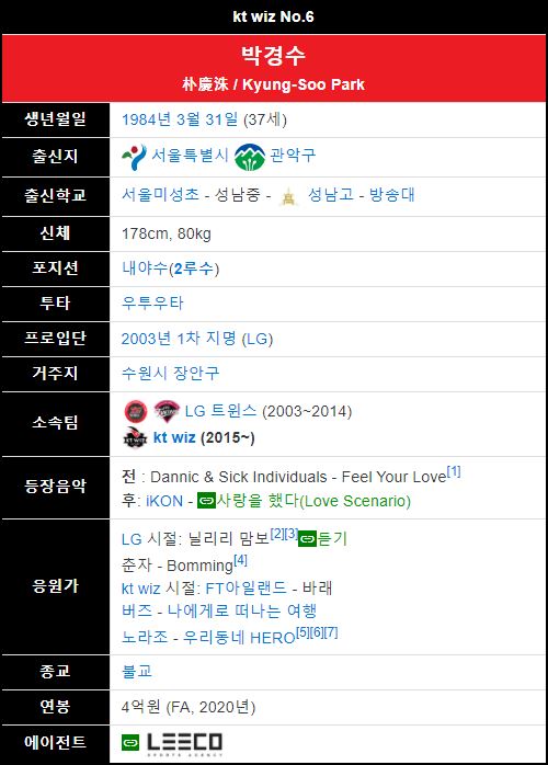 지금까지 kt wiz 베테랑 타자 박경수 야구선수에 대해서 알아보았습니다. 박경수 야구선수는 안전감있는 수비능력과 좋은 선구안 그리고 2루수 답지 않은 장타력을 갖추고 있어 kt 위즈 입장에서 공격과 수비 모든 방면에서 활용도가 높은 선수로 압도적인 존재감을 가진 선수입니다.