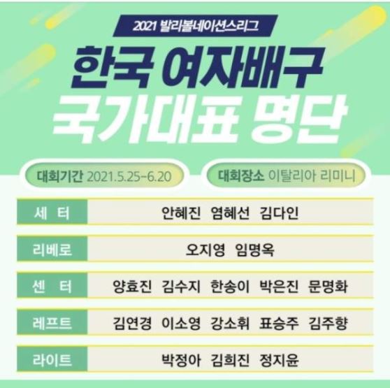 대한민국 여자배구 대표팀은 오는 2021년 5월 25일 중국과의 경기를 시작으로 총 15개 국가와의 경기를 치루게 됩니다. 이번 2021 VNL 발리볼 네이션스리그 대표팀 명단에서 V리그를 대표하는 선수들이 부상과 재활 그리고 다른 이유로 대거 이탈하게 되면서 걱정을 모았습니다.