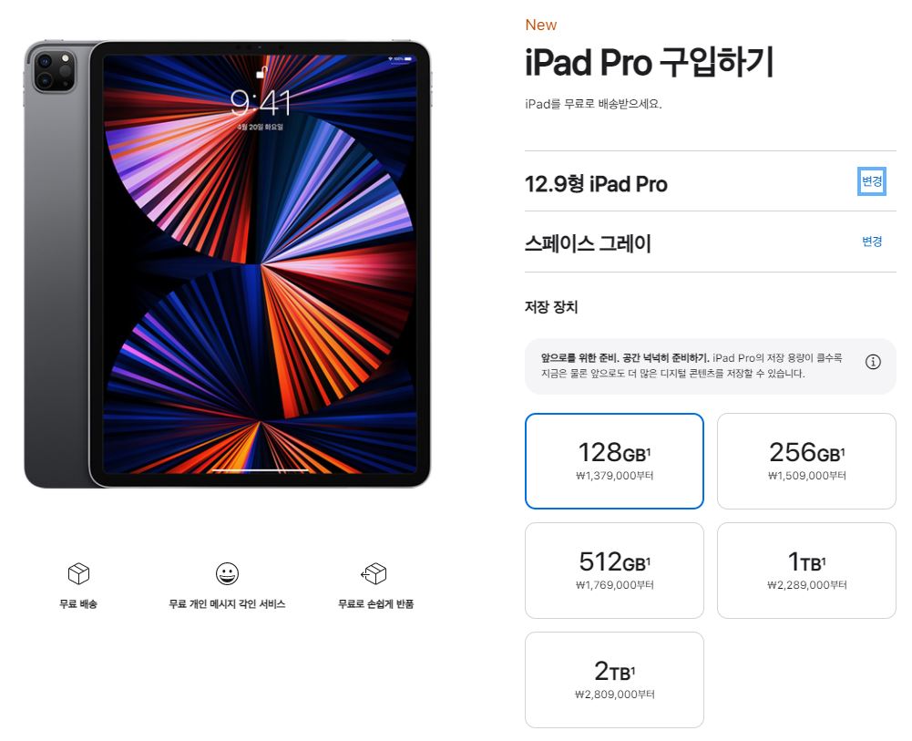 아이패드 프로 5세대 국내 출시일은 2021년 6월 1일입니다. 그리고 아이패드 프로 5세대 가격은 11형 디스플레이 기준 999,000원부터 2,429,000원까지 구성되어 있고 12.9형 디스플레이 기준 1,379,000원부터 2,809,000원까지 용량별 스펙별로 구분되어 구성되어 있습니다.
