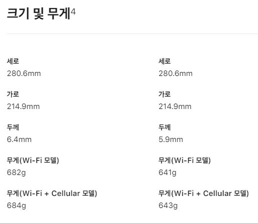 아이패드 프로 5세대 12.9인치 모델 기준으로 두께가 0.5mm상승하였고 무게도 약 40g정도 상승하였습니다. 보통은 다음 세대가 등장하면 좀더 얇아지고 좀더 가벼워져야하는 것이 일반적이지만 이번 아이패드 프로 5세대의 경우에는 다른 모습을 보여주었습니다.