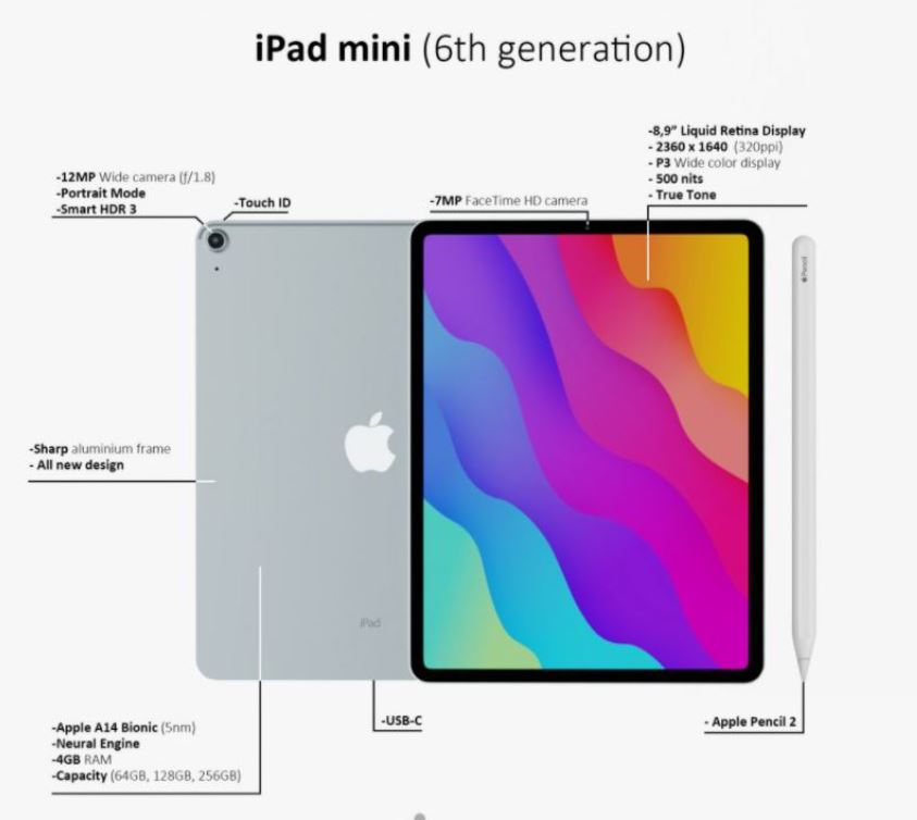 그리고 아이패드 미니 6세대는 홈버튼이 사라지면서 Face ID가 사용될 것이라는 의견이 많았지만, Face ID가 아니라 아이패드 에어 4세대와 동일하게 상단 전원버튼에 지문인식센서가 탑재된 Touch ID가 탑재되어 출시할 것입니다. 하단부 전원 포트는 라이트닝 포트에서 USB-C 포트로 변경될 것입니다.