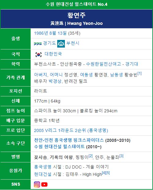 현대건설 황연주 배구선수는 경기도 부천시 출신으로 나이는 1986년 8월 13일 생으로 만 35세입니다. 황연주 배구선수 키는 177cm이고 몸무게는 64kg으로 라이트 포지션으로 활동하고 있고, 경기대학교를 졸업한 후 2005 V리그 신인 드래프트 1라운드 2순위로 흥국생명의 지명을 받아 프로데뷔를 하였습니다.