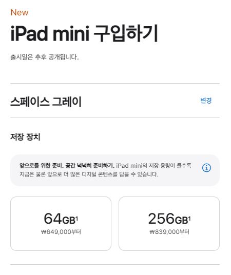 아이패드 미니 6세대는 셀룰러와 와이파이 별로 64GB 모델과 256GB 모델로 출시될 것입니다. 최저 사양인 아이패드 미니 6세대 가격은 와이파이 64GB 모델 기준 649,000원으로 전작에 대비 150,000원 상승된 금액입니다. 폼팩터가 변경되면서 출고가 인상은 피할 수 없었던 것 같습니다.