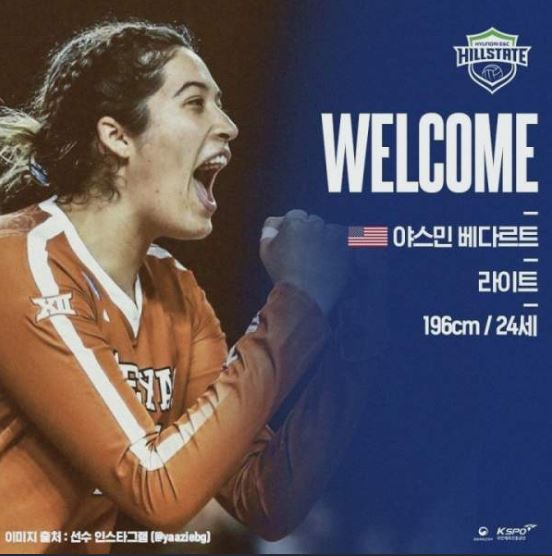 수원 현대건설 힐스테이트 배구단 야스민 베다르트 배구선수는 로스앤젤레스 출신으로 국적은 미국과 이스라엘 이중국적을 가지고 있습니다. 현대건설 야스민 배구선수 나이는 1996년 11월 8일 생으로 만 24세이고 신장은 196cm입니다.