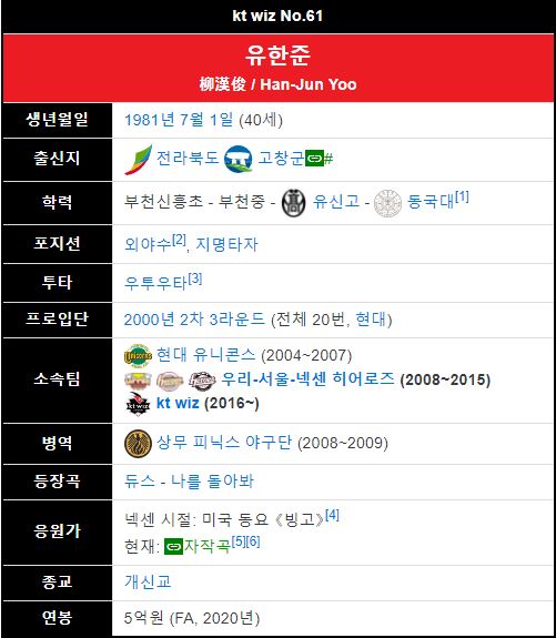 kt 위즈 유한준 야구선수는 전라북도 고창군 출신으로 나이는 1981년 7월 1일 생으로 만 40세입니다. 유한준 야구선수 키는 186cm이고 몸무게는 97kg입니다. 동국대학교를 졸업하고 2000년 KBO 신인 드래프트 2차 3라운드, 전체 20번으로 현대 유니콘스에 지명을 받아 입단하였습니다.