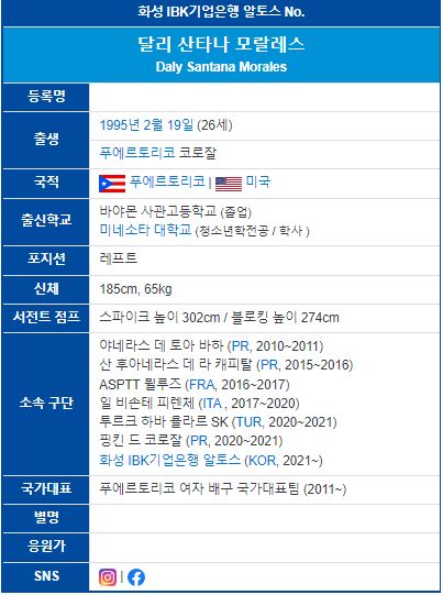 ibk 기업은행 달리 산타나 배구선수는 미국, 푸에르도리코 국적을 가지고 있으며 푸에르토리코 코로잘 출신으로 1995년 2월 19일 생으로 만 26세입니다. 달리 산타나 배구선수 키는 185cm이고 몸무게는 65kg, 스파이크 높이는 302cm, 블로킹 높이는 274cm입니다.