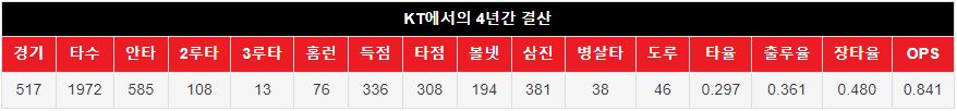 황재균 야구선수는 2018년 시즌부터 2021년 시즌까지 4시즌 동안 kt wiz 유니폼을 입고 0.297타율, 76홈런, 308타점, 336득점, 194사사구, 381삼진, 46도루, 0.361출루율, 0.480장타율, 0.841OPS를 기록하였습니다. 그리고 무엇보다 황재균 야구선수는 2021년 시즌 kt wiz가 통합우승을 차지하는데 이바지하였습니다.