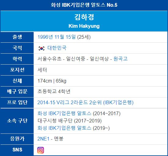 IBK 기업은행 김하경 배구선수는 새로운 방법과 형태의 훈련을 통해 성장하고 있습니다. 김하경 배구선수 나이는 1996년 11월 15일 생으로 만 25세이고 키는 174cm, 몸무게는 65kg으로 지난 2014-15 V리그 신인 드래프트 2라운드 2순위로 화성 IBK 기업은행 알토스의 지명을 받아 프로구단에 입단하였습니다.