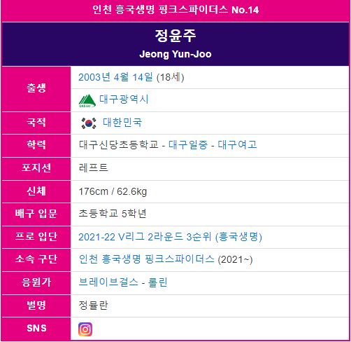 정윤주 배구선수는 대구광역시 출신으로 나이는 2003년 4월14일 생으로 만 18세의 신인선수입니다. 정윤주 배구선수 키는 176cm이고, 몸무게는 62.6kg으로 팀내에서 레프트 포지션으로 활동하고 있습니다. 대구여자고등학교를 졸업하고 2021-22 V리그 신인 드래프트 2라운드 3순위로 흥국생명의 지명을 받아 입단하게 되었습니다.