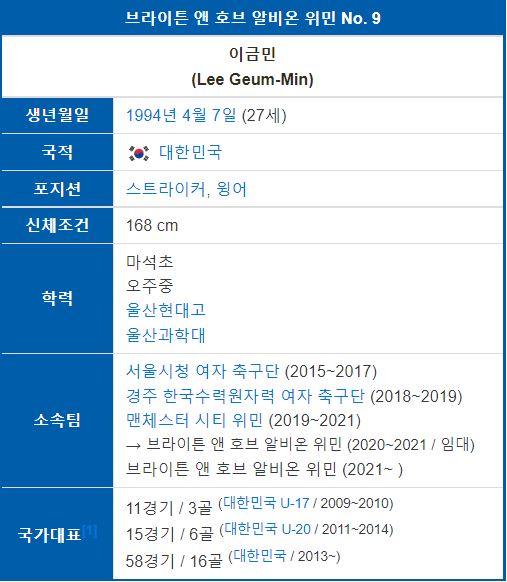 지난 2019년 7월 대한민국 여자축구 국가대표팀 이금민 선수가 한국 여자축구 선수로는 3번째로 잉글랜드 리그로 진출하게 되었습니다. 이금민 축구선수와 계약을 한 팀은 맨체스터 시티 위민입니다. 그리고 현재는 더 많은 경기 출전을 위해서 브라이튼 앤 호브 알비온 위민으로 임대 이적한 상태입니다.